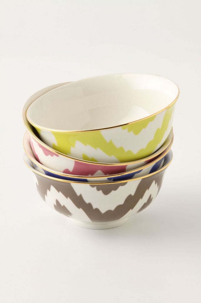 May we suggest one simple way to dress up a table? Consider using vintage red Ikat bowls. Ikat bowls are already very unique and bright, we paired them with your basic patternless white china. Anthropologie brand revived this old Uzbek Soviet pattern about a decade ago. Ever since home decor magazines have been widely featuring these Ikat bowls .